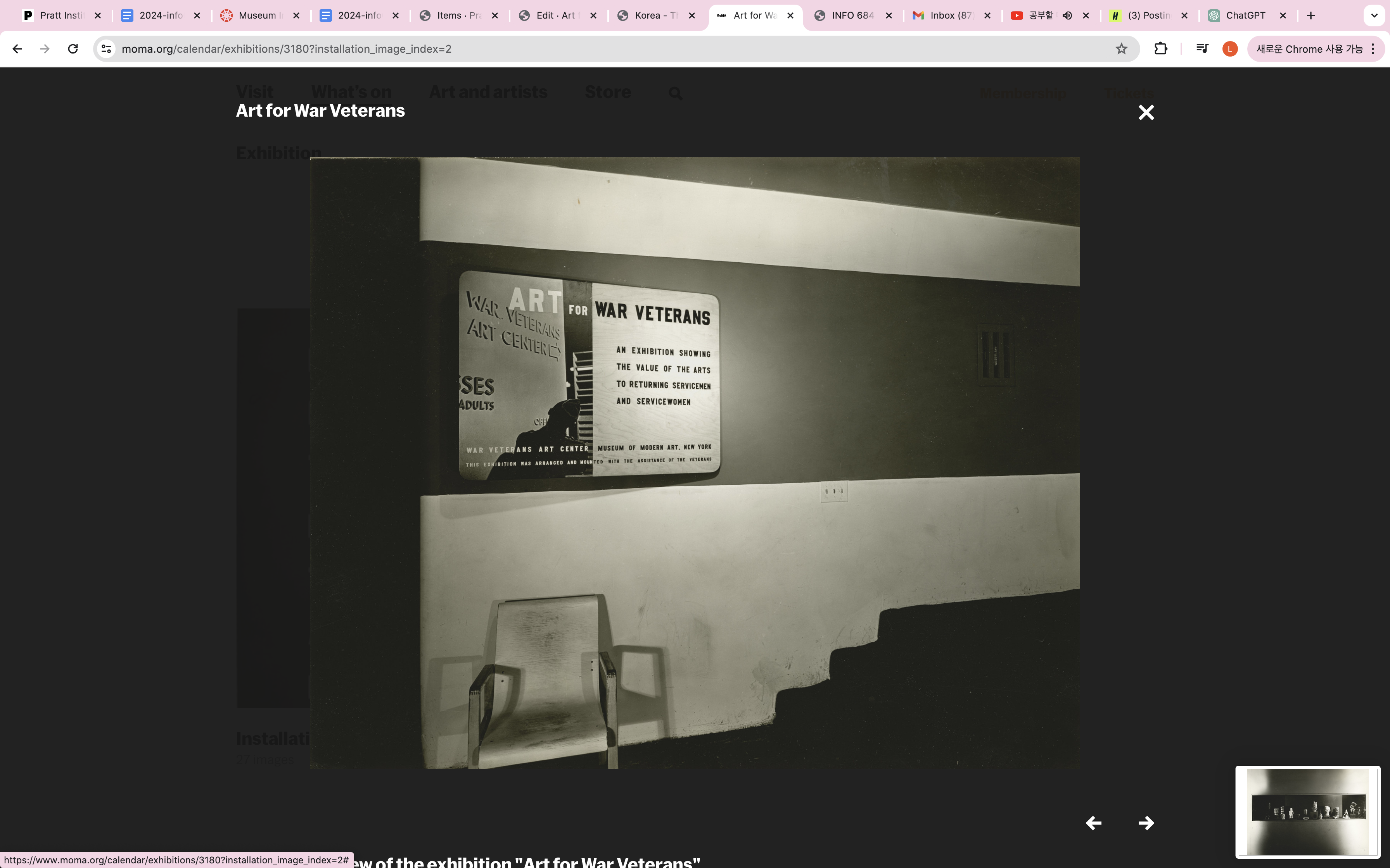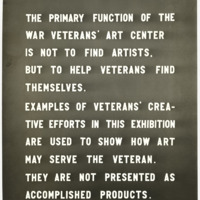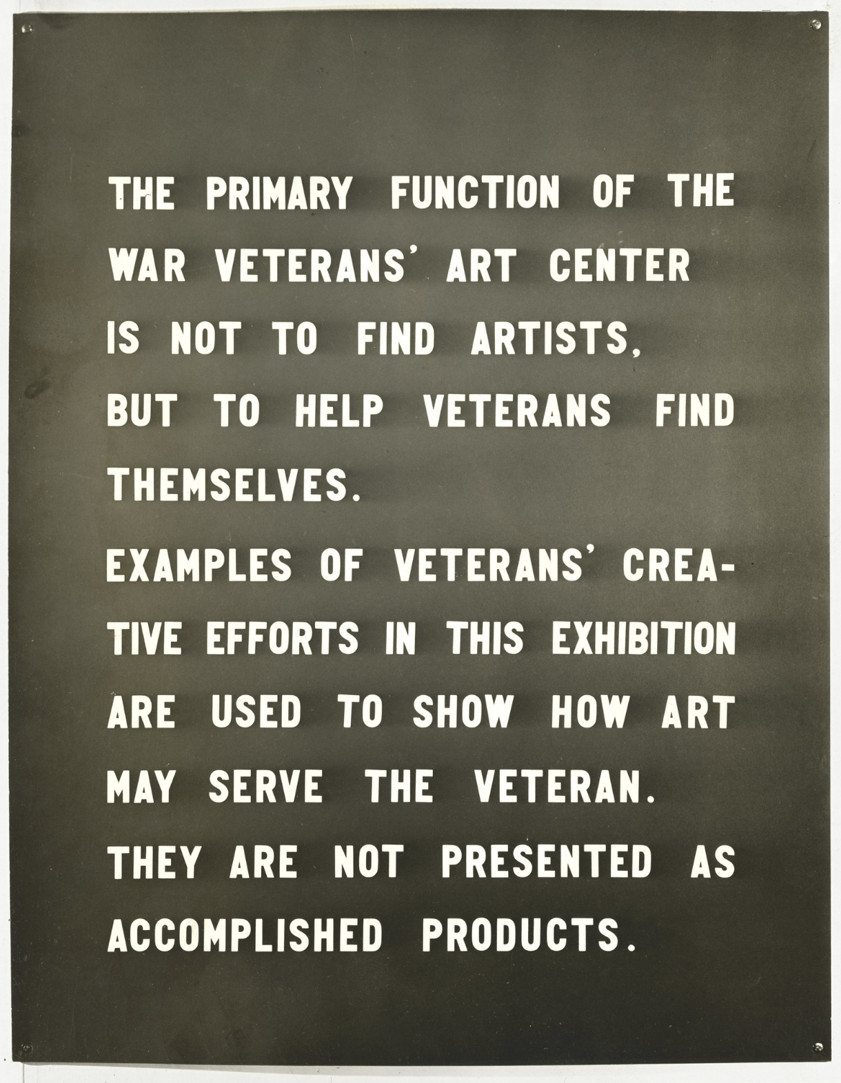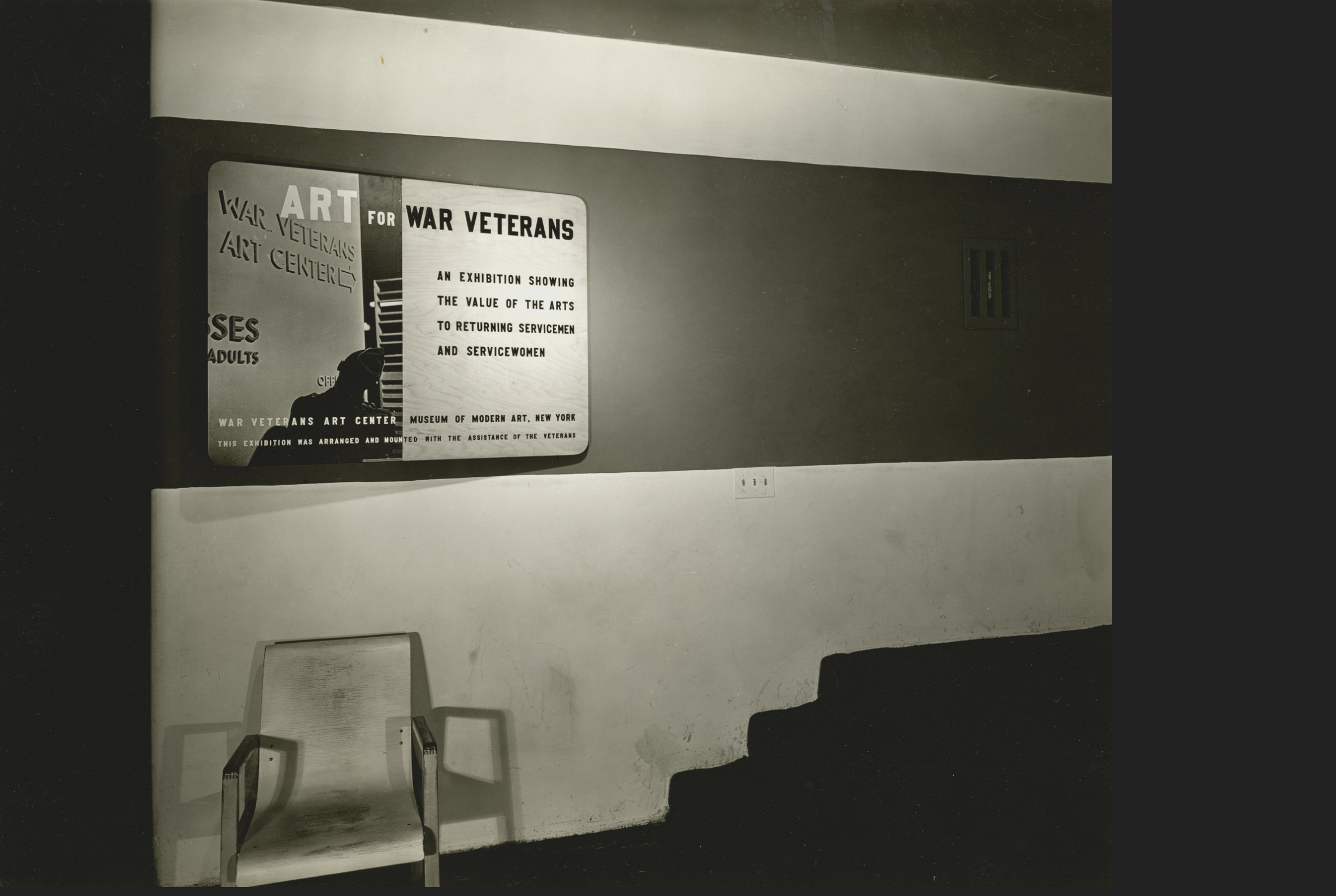 - Retrieved from the MoMA Press Release: "I had a lot of time to think while I was in service, I decided that life should be more than routine living and grubbing for money, and I promised myself that if I ever came out alive I was going to do a lot of the things that are worthwhile. Art is one of them. That's why I'm here!" This remark by an ex-infantryman best expresses the motive of returned service men and women in Joining the War Veterans' Art Center. On Wednesday, September 26, the Center will show the fruits of its first year's work in an exhibition Art for War Veterans opening in the auditorium galleries of the Museum of Modern Art, 11 West 53 Street, where it will remain on view through November 25.