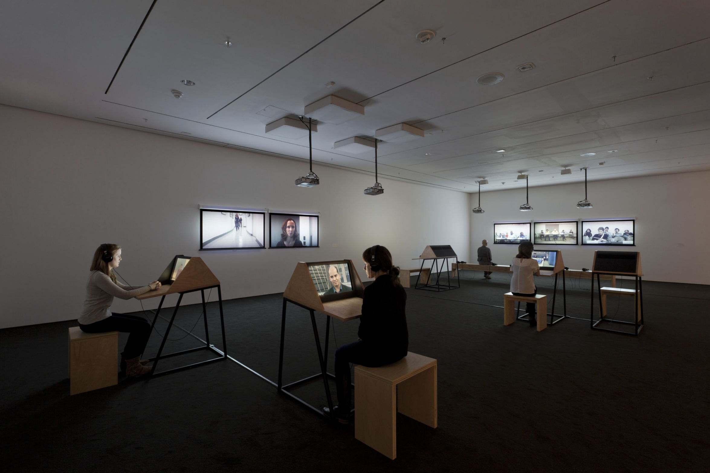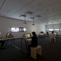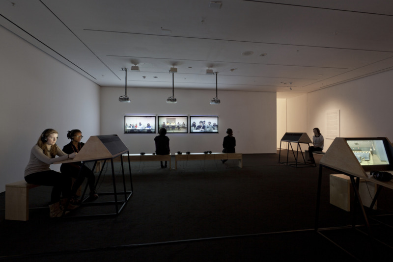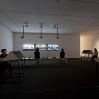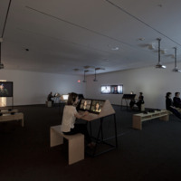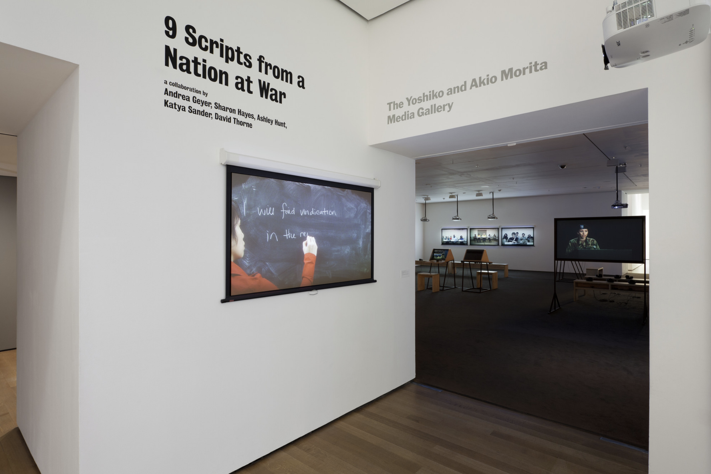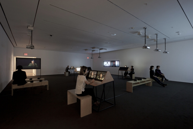 - 9 Scripts from a Nation at War (2007), a 10-channel video installation recently acquired by MoMA, marks the first work for which artists Andrea Geyer, Sharon Hayes, Ashley Hunt, Katya Sander, and David Thorne have collaborated. The work responds to knowledge production and communication in the context of the Iraq war since the initial invasion by U.S. military forces in March 2003. The 10 videos comprising the large-scale, spatial installation cast inquiry into the position of the individual amidst roles constructed by war. Each video stages the speaking of a script from the following perspectives: citizen, blogger, correspondent, veteran, student, actor, interviewer, lawyer, detainee, and source. The scripts are enacted by both actors and non-actors, some speaking their own words, some reciting the words of others. Displayed as projections and seated viewing stations in a circuitous, non-narrative structure, the performative videos create a charged environment questioning the implications of war on individual and collective subjectivity.