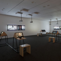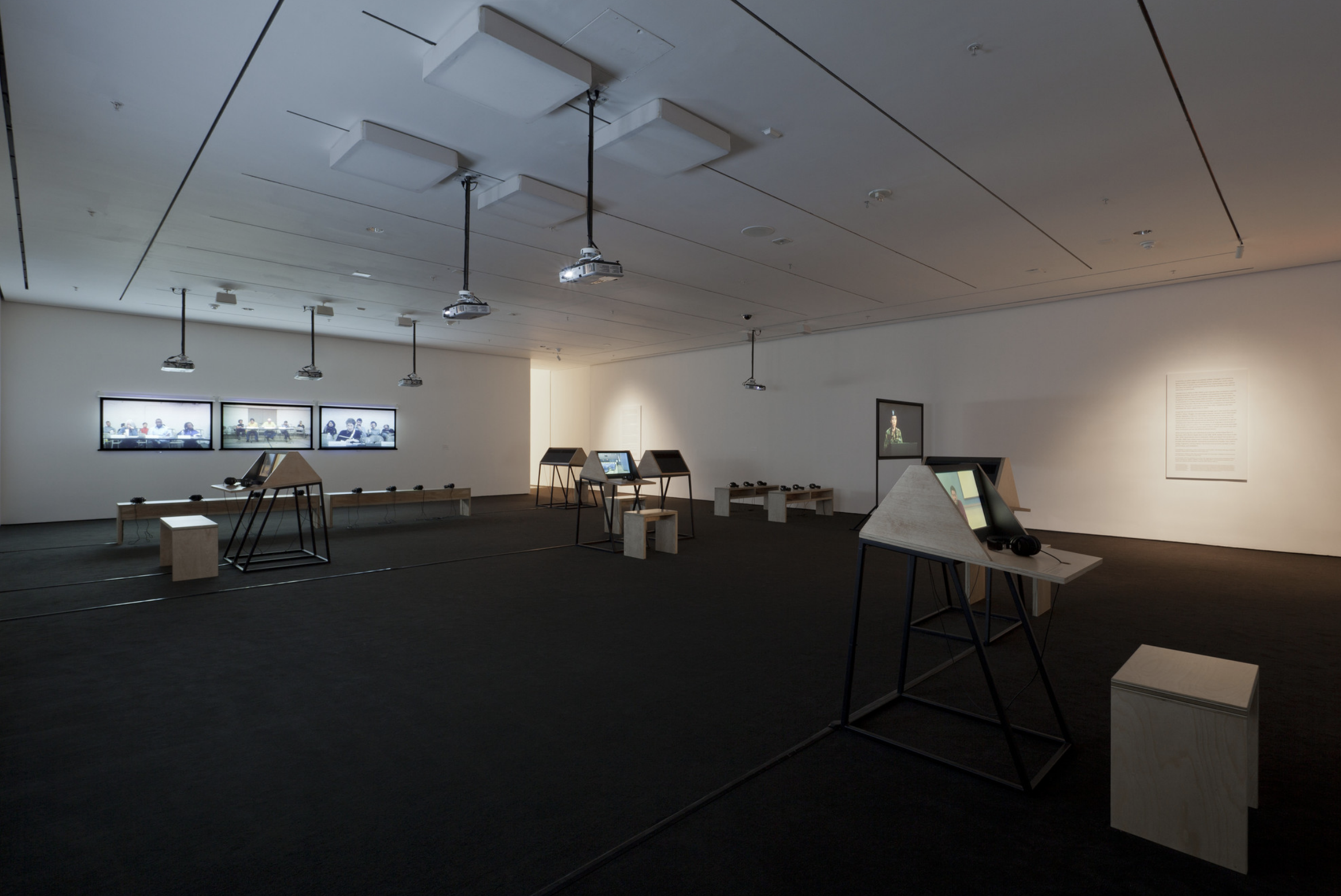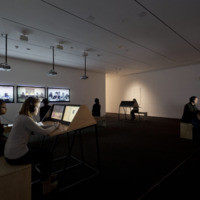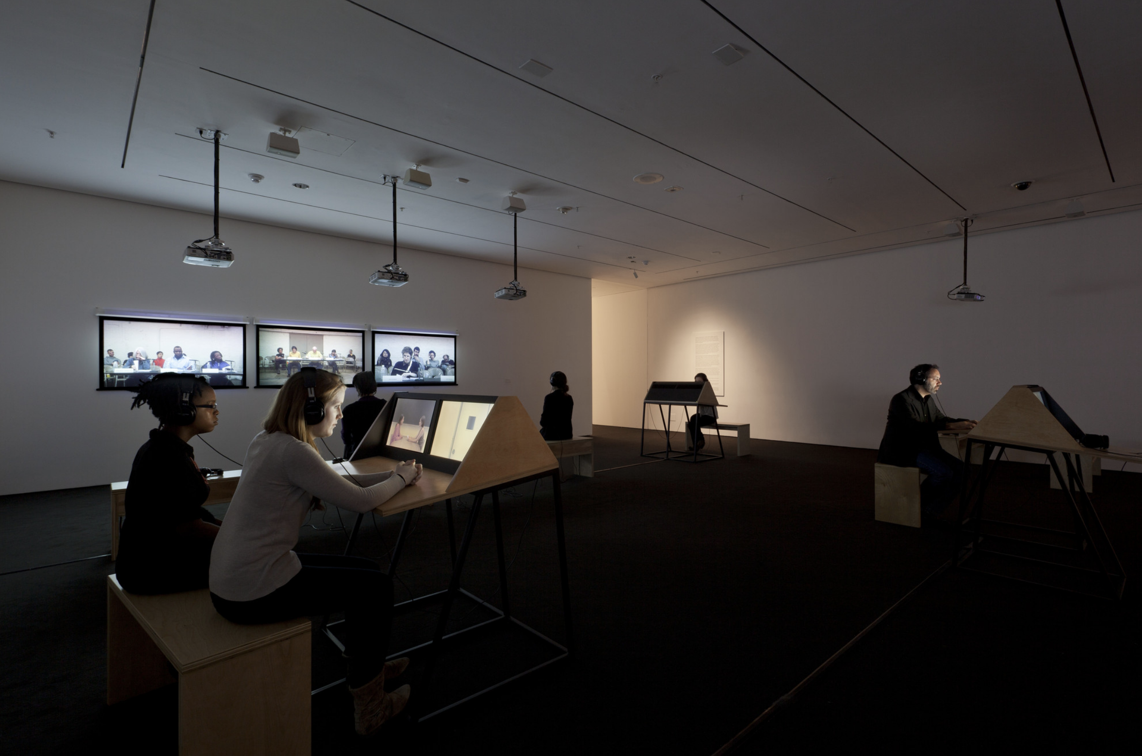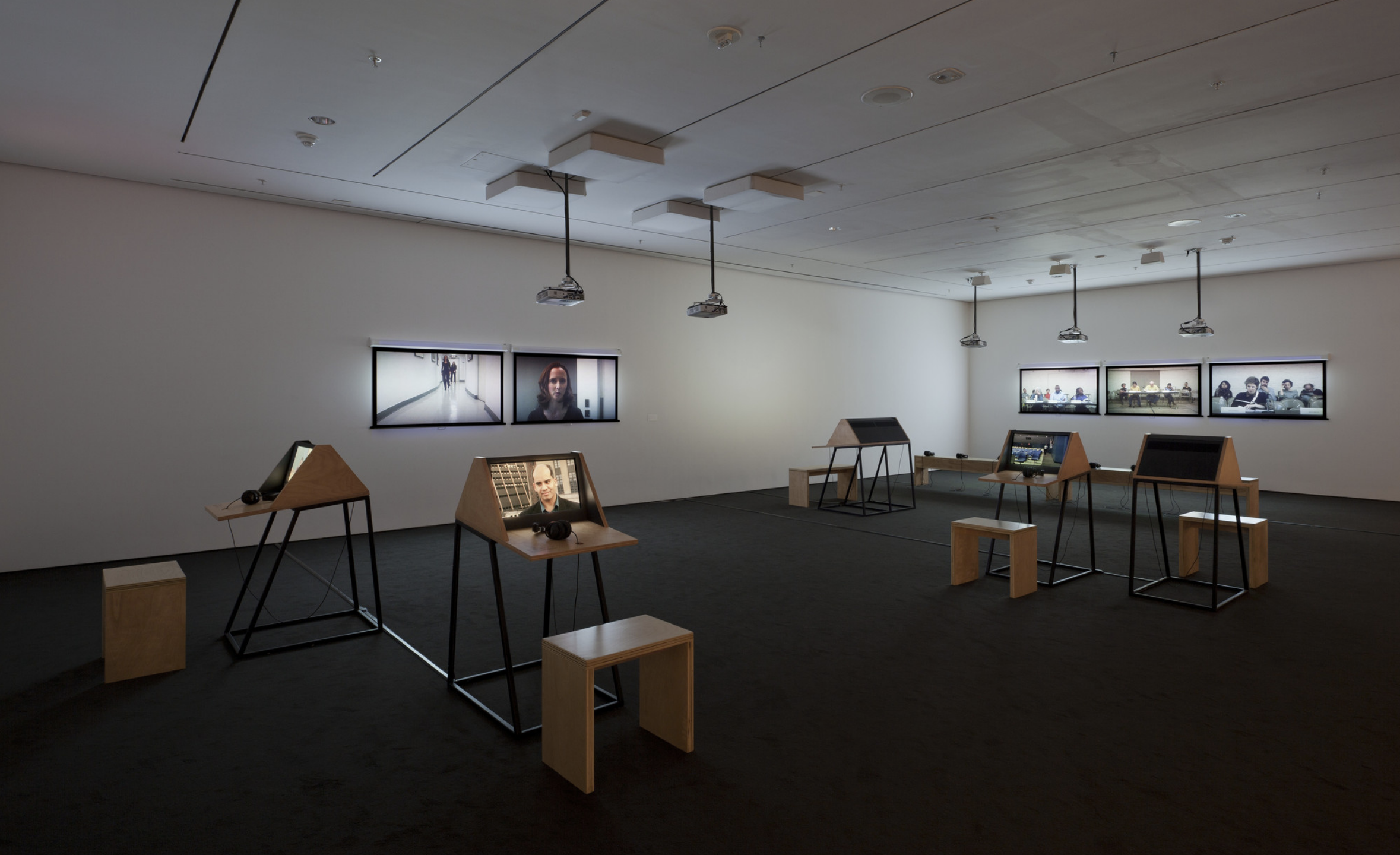 - 9 Scripts from a Nation at War (2007), a 10-channel video installation recently acquired by MoMA, marks the first work for which artists Andrea Geyer, Sharon Hayes, Ashley Hunt, Katya Sander, and David Thorne have collaborated. The work responds to knowledge production and communication in the context of the Iraq war since the initial invasion by U.S. military forces in March 2003. The 10 videos comprising the large-scale, spatial installation cast inquiry into the position of the individual amidst roles constructed by war. Each video stages the speaking of a script from the following perspectives: citizen, blogger, correspondent, veteran, student, actor, interviewer, lawyer, detainee, and source. The scripts are enacted by both actors and non-actors, some speaking their own words, some reciting the words of others. Displayed as projections and seated viewing stations in a circuitous, non-narrative structure, the performative videos create a charged environment questioning the implications of war on individual and collective subjectivity.