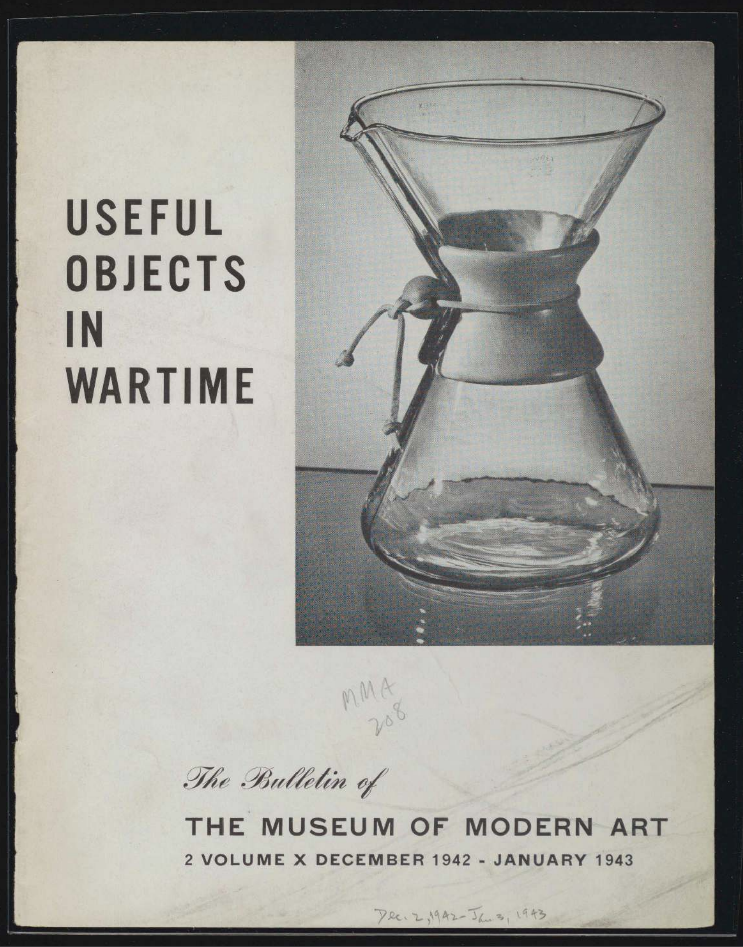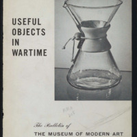 - Retrieved from the MoMA Press Release: Baking pans made of paper, a cornhusk doormat, an open-top hamper-cart for the free-wheeling of groceries, a plastic sink stopper, a felt eyeglass case and many other useful objects for the civilian, particularly in non-priority glass, comprise part of the exhibition of Useful Objects in Wartime which opens at the Museum of Modern Art, 11 West 53 Street, Wednesday, December 2. The rest of the exhibition is devoted to needs of Army and Navy men, WAACS and WAVES. A few well designed articles for civilian defense are also included. And, Just for fun even in wartime, sheets of gay-colored paperboard from which extremely modern domestic animals, dude cowboys, and other toys may be punched out and fitted ingeniously together, are shown. Everything in the exhibition sells for $10 and under.