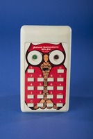 This electronic game tests children on the basic operations of arithmetic. It has an off-white plastic case, and a paper sticker attached under the keyboard and display. The sticker is decorated with a drawing of an owl. The device has eighteen rectangular plastic keys. These include ten digit keys, a decimal point key, a clear key, four function keys, a total key and a question mark key. The on/off switch is at the center of the top row of keys. The display consists of two lights that serve as eyes for the owl, one green and the other red.