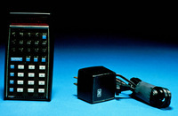 The HP-35 was the first handheld electronic calculator to compute all the functions represented on a slide rule. It has a black plastic case and a total of thirty-five square or rectangular plastic keys. These include ten digit keys, a decimal point key, and a pi key, all colored tan. In addition there are four arithmetic function left of the digit keys, a relatively long enter key, a change sign key, and enter exponent key, a clear x key, and a clear key, all in blue. Additional black keys are for powers, logs to base ten, natural logs, exponents, square roots, trigonometric functions (sine, cosine, tangent and the inverses of these), simple inverses, exchange, roll down, store, and recall. Above the keys is an on/off switch. There is no hole next to the switch to indicate that the display is on, as there was in the very first HP-35 calculators. Behind the switch is a red LED display that shows results. Numbers with absolute value between one hundredth and 10 billion are given in decimal form. Smaller or larger ones appear in scientific notation, with the appropriate power of ten occupying the three rightmost digit places (two for digits, one for a sign). The negative sign for the result, if needed, is at the far left.