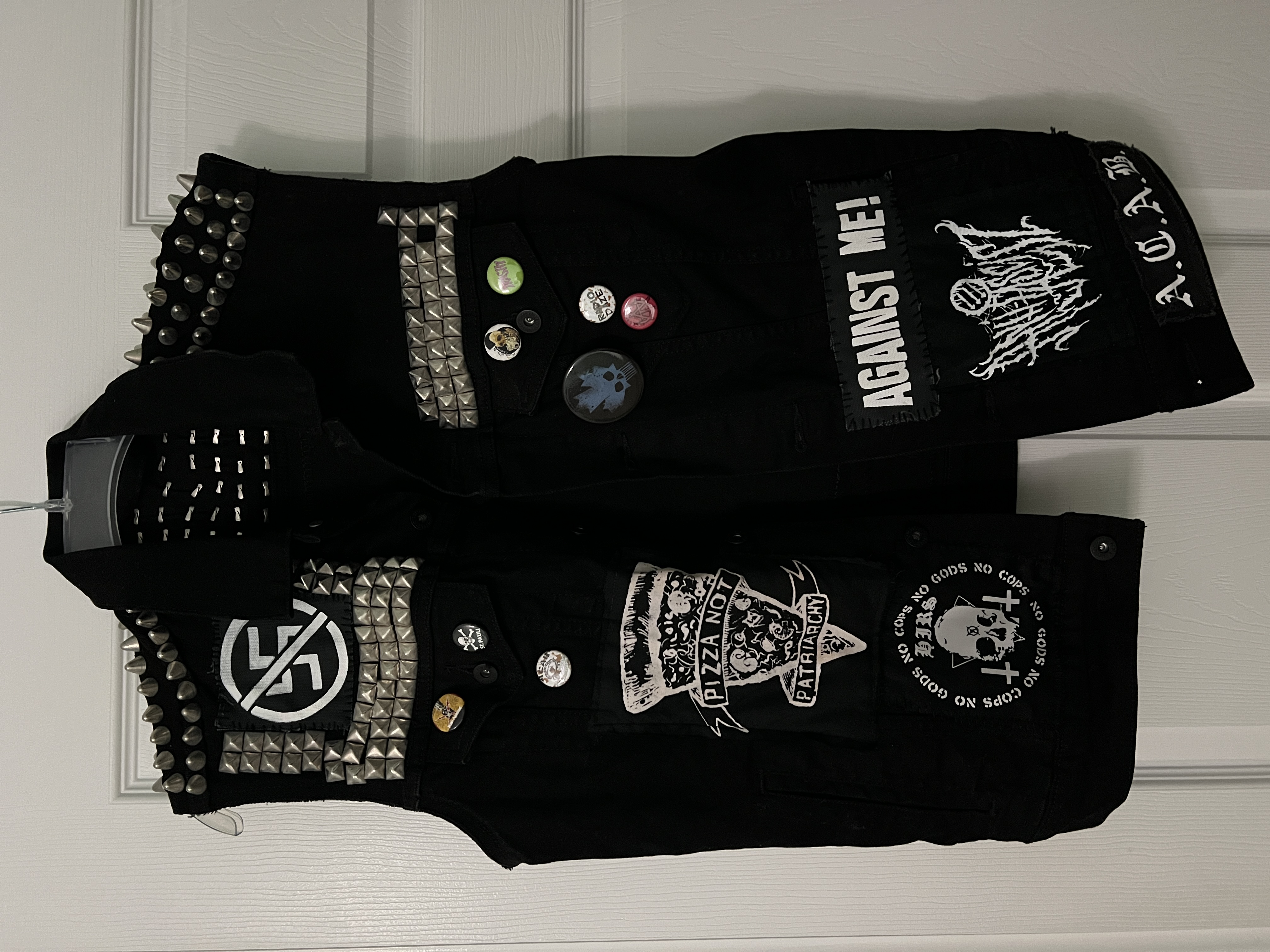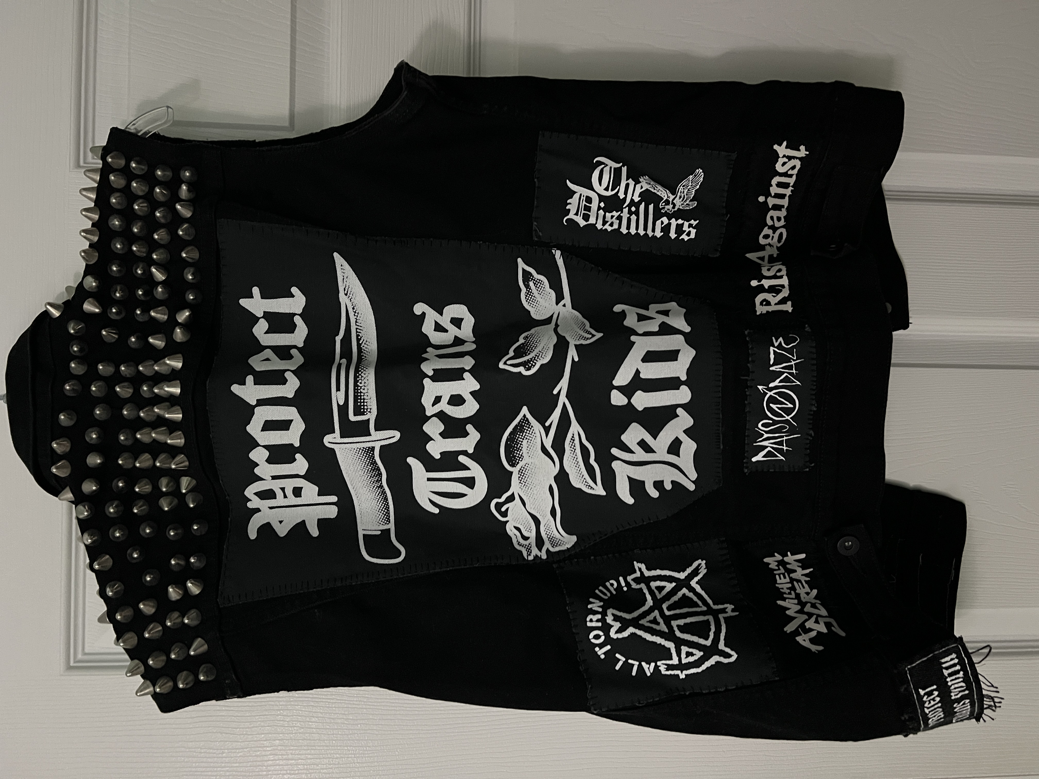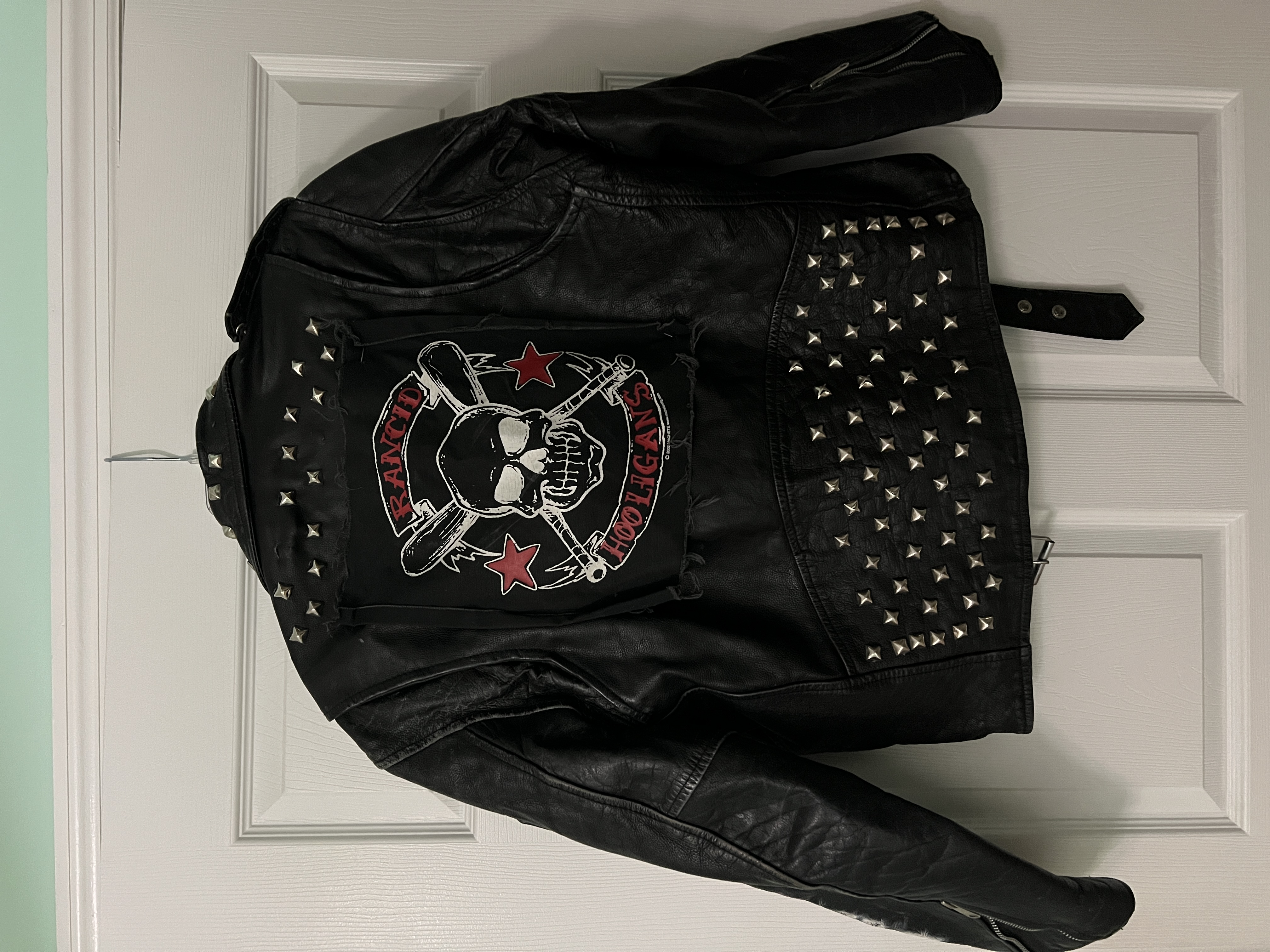 Front of Battle Jacket 4 Leather Jacket with safety pinned cloth attachments and spray painted left sleeve -