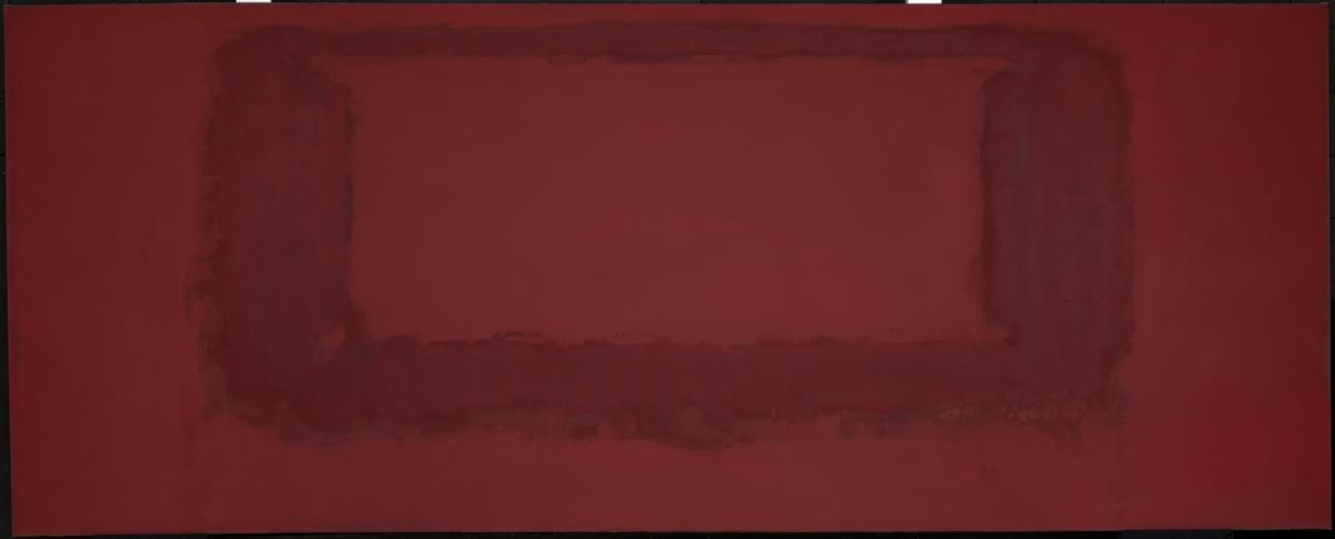 Red on Maroon is a large unframed oil painting on a horizontally orientated rectangular canvas. The base color of the painting is a vibrant crimson. This is overlaid with a large maroon rectangle, which in turn encloses a smaller red rectangle, suggesting a window-like structure. The maroon paint forms a solid block of color but the edges seep slightly, blurring into the areas of red. Different pigments have been used within the red, blending shades of crimson and carmine. This changing tone gives a sense of depth in an otherwise abstract composition.