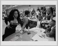 Octavia and Danielle, Revlon Ball, Manhattan, NY, 1997 "A black and white photographic print depicting Octavia St. Laurent and Danielle Revlon, two competitors in the Femme Queen Realness category at the Revlon Ball in Manhattan, NY in 1997. Both Octavia and Danielle are posing leaning on a circular table in the foreground of the image. Each one leans with one hip and one hand on the table and the other hand on their hips. Octavia is on the left side of the image, wearing a black strapless bustier with ruffle details along the bustline and a sheer black button front shirt, unbuttoned and tied around her waist. Danielle, on the right, wears a dark-colored halter dress and a long strand of pearls triple-wrapped around her neck. Both Octavia and Danielle face a man, the ball's judge Tony Revlon, seated on the other side of the table. A small statuette trophy is sitting on the table. A large crowd of spectators are visible sitting and standing at a line of rectangular tables in the background. There are no inscriptions, front or back." from Collection of the Smithsonian National Museum of African American History and Culture -