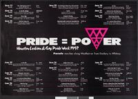 Pride = power : Houston Lesbian & Gay Pride Week 1992 Text continues: "Parade marches along Westheimer from Dulvany to Whitney."Pink and white text on black paper. The 'W' in power is replaced with an inverted pink triangle with several other smaller triangles formatted inside of it. The top and bottom half of the poster contains a list of pride related events spanning from June 13-28, 1992. -