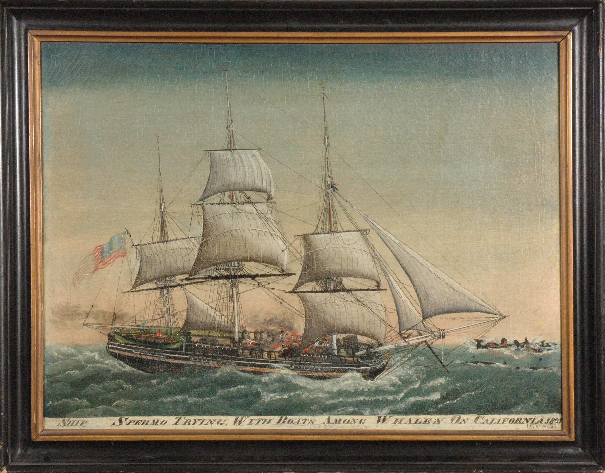Titled in lower center: Ship Spermo Trying With Boats Among Whales On California 1821. Signed in lower right: J. Fisher.